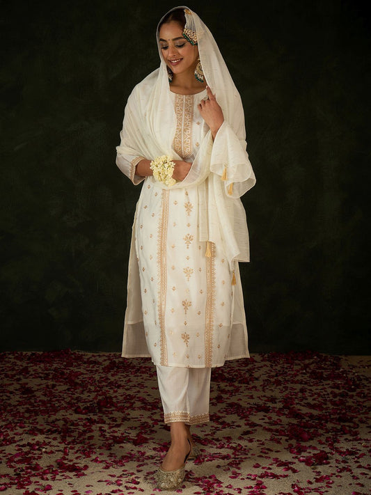 Dhiyona IE Floral Printed Thread Work Chanderi Silk Kurta with Trousers & Dupatta