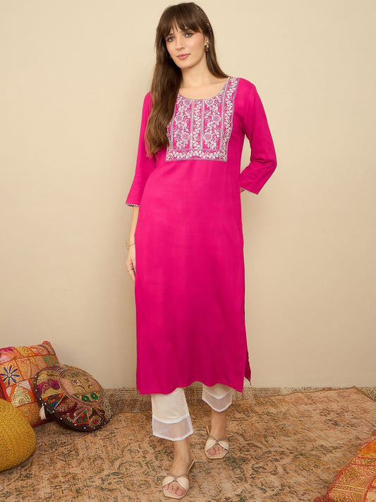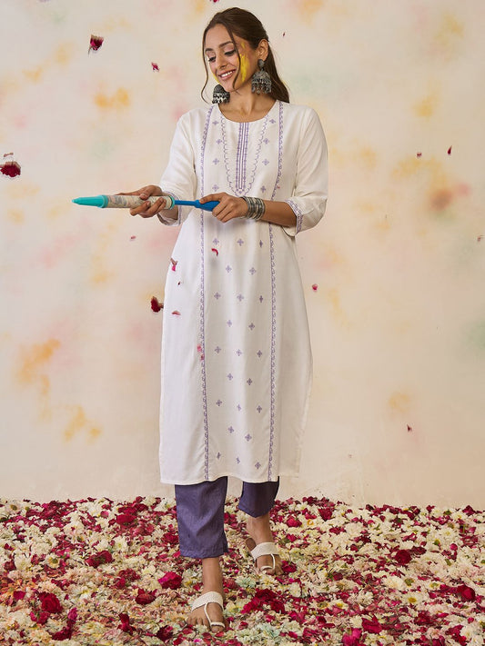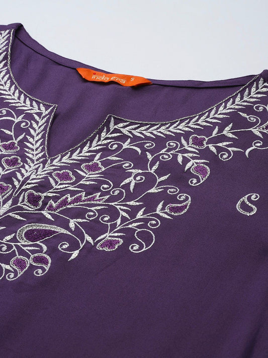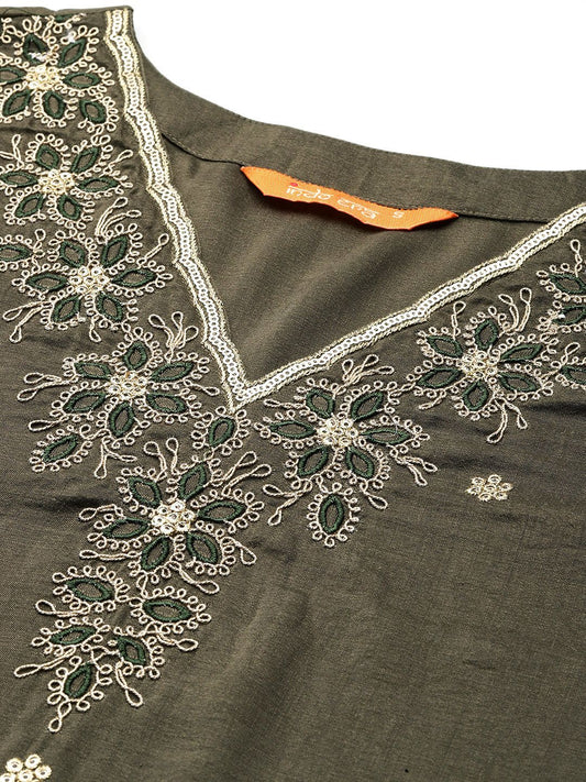 Dhiyona IE Floral Embroidered Liva Straight Kurta With Trousers & Dupatta