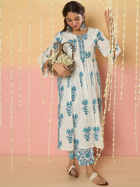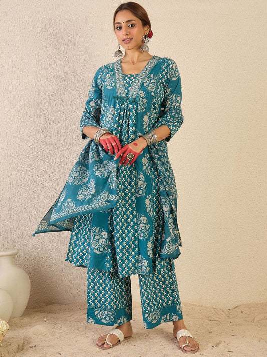Dhiyona IE Floral Printed Empire Pure Cotton Anarkali Kurta With Trouser & Dupatta