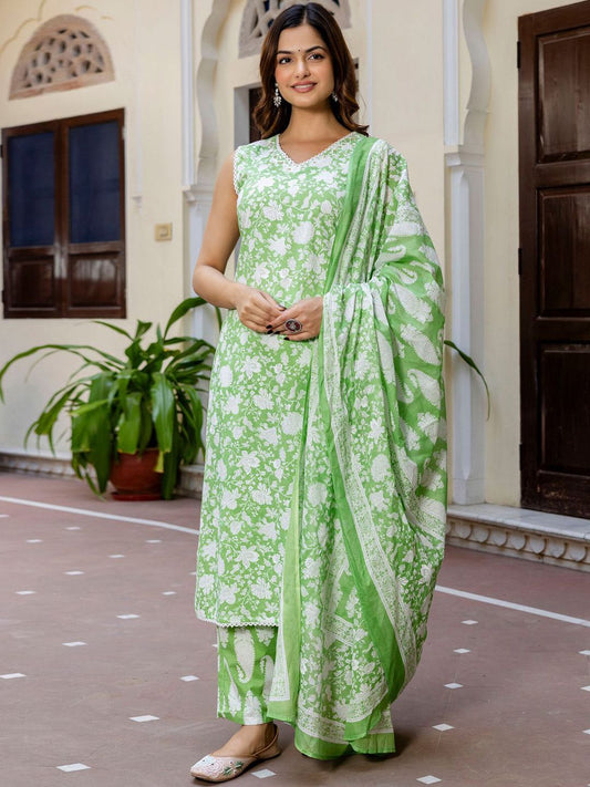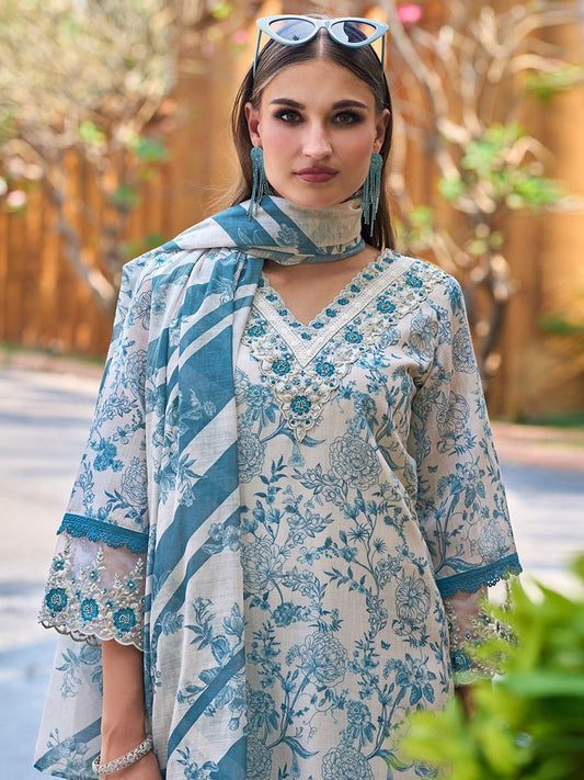 Dhiyona IE Floral Printed Regular Thread Work Pure Cotton Kurta with Trousers & Dupatta