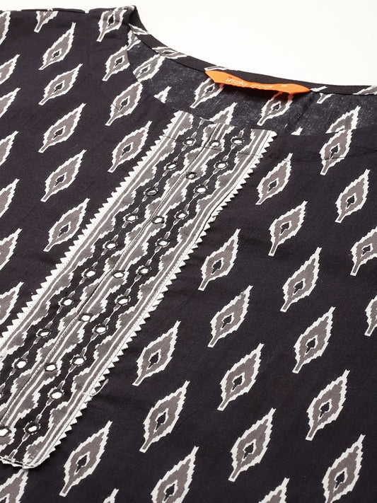Dhiyona IE Black Geometric Printed V-Neck Pure Cotton Straight Kurta with Salwar & Dupatta