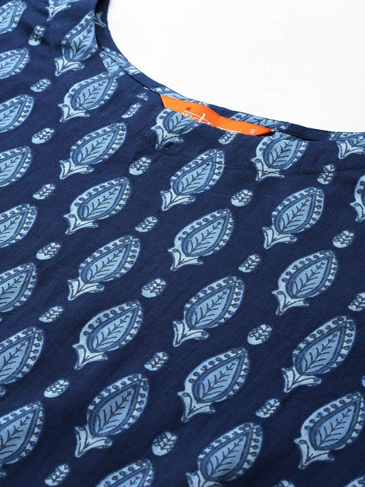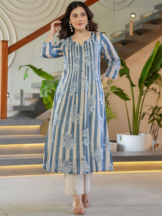Dhiyona IE Floral Printed Round Neck A-Line Pure Cotton Kurta With Trousers