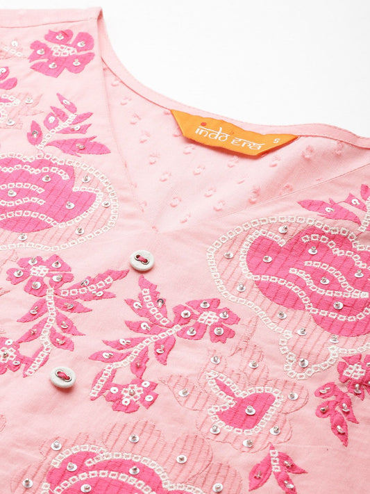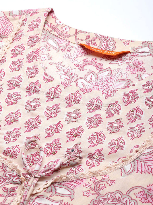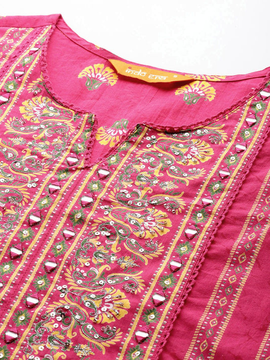 Dhiyona IE Floral Printed Panelled Mirror Work Pure Cotton Kurta Set