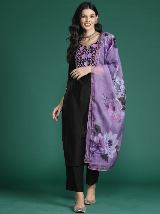 Dhiyona IE Floral Embroidered Liva Kurta with Trousers & Dupatta