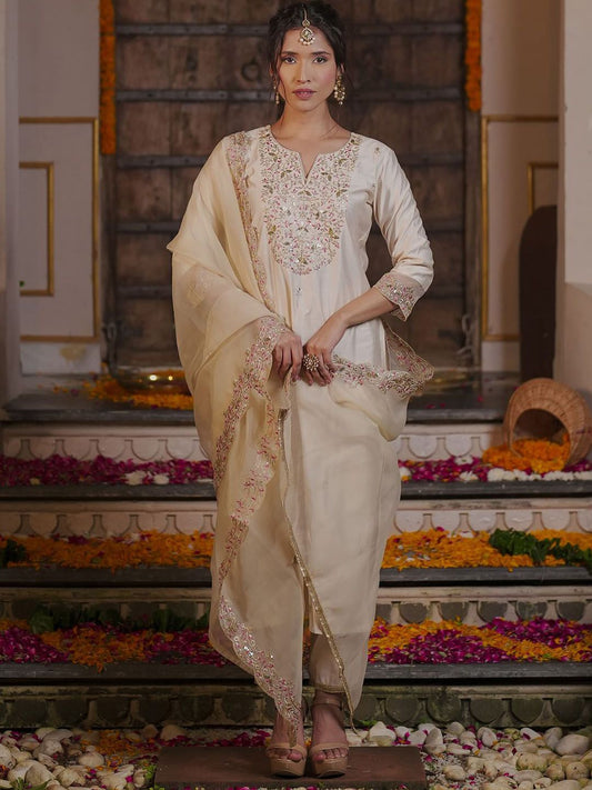 Dhiyona IE Women Floral Yoke Design Regular Thread Work Kurta with Trousers & Dupatta