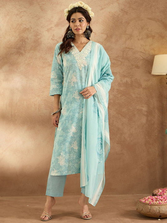 Dhiyona IE Floral Yoke Design V-Neck Pure Cotton Straight Kurta With Trousers & Dupatta