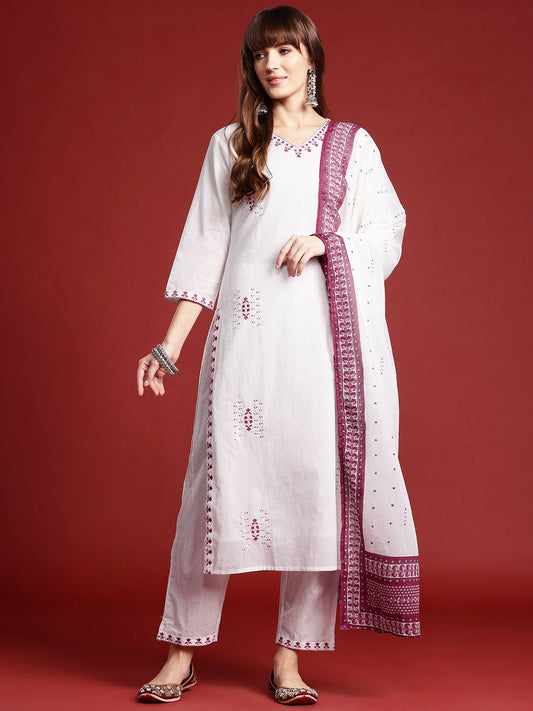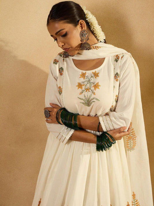 Dhiyona IE Floral Embroidered Pure Cotton Kurta with Trousers & Dupatta