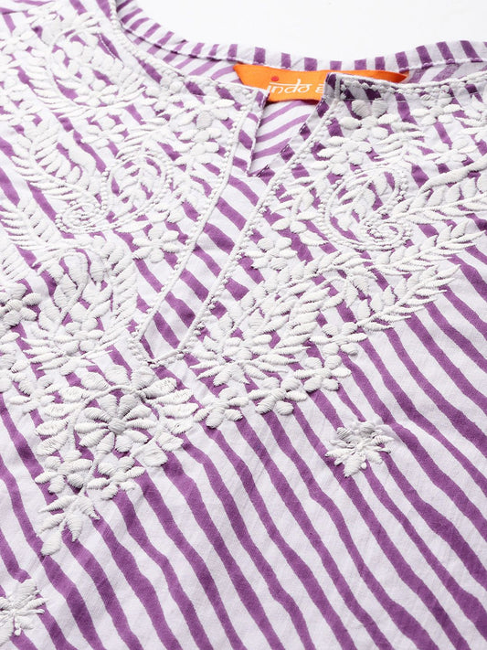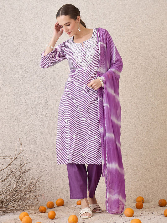 Dhiyona IE Leheriya Printed Thread Work Pure Cotton Kurta With Trousers & Dupatta