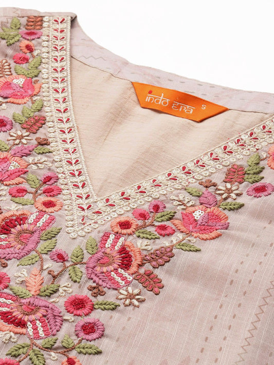 Dhiyona IE Floral Embroidered Thread Work Linen Kurta with Trousers & With Dupatta