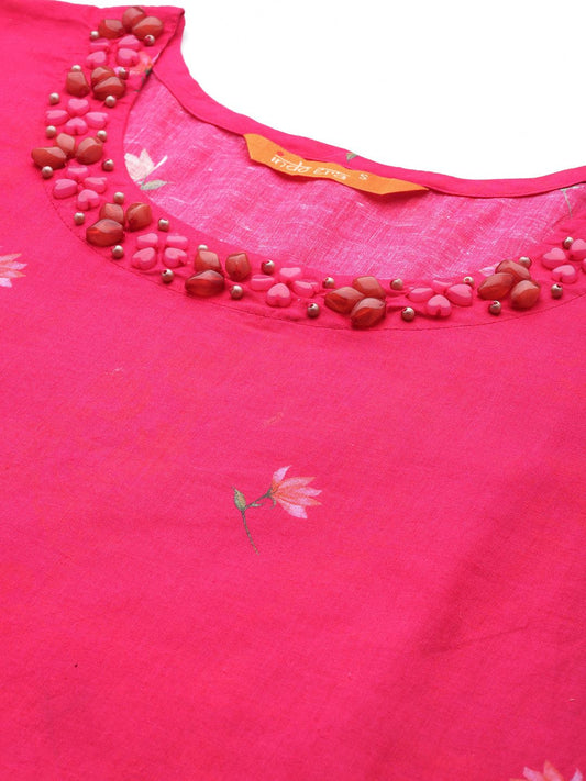 Dhiyona IE Floral Printed Beads & Stones Pure Cotton Kurta With Trousers & Dupatta