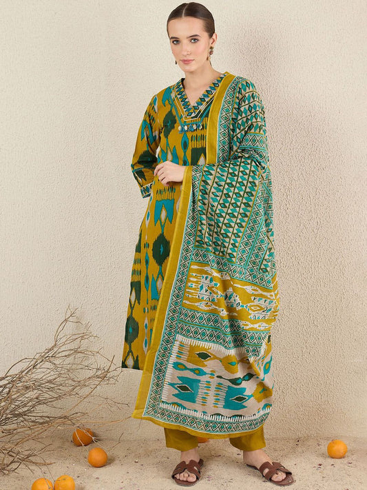 Dhiyona IE Geometric Printed Regular Pure Cotton Kurta with Trousers & Dupatta