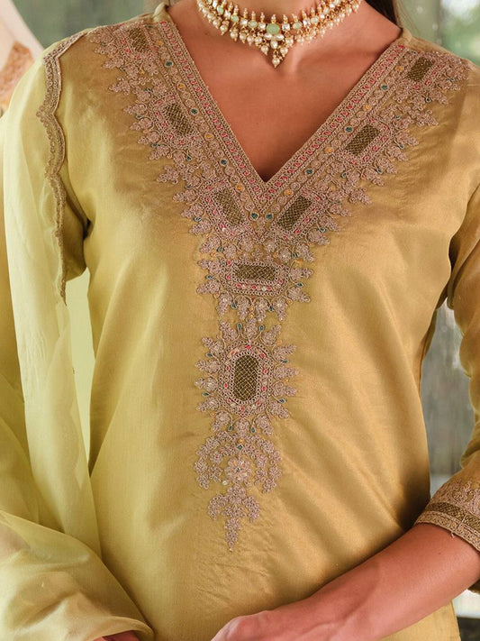 Dhiyona IE Yellow Paisley Embroidered Regular Straight Kurta With Trousers & Dupatta