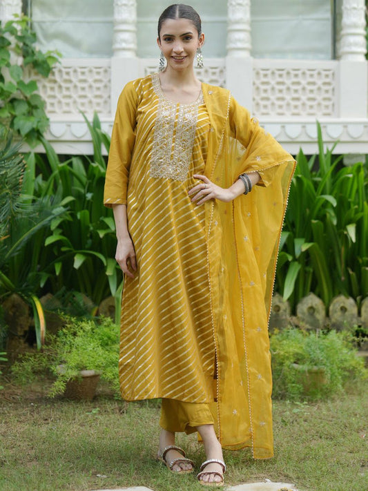 Dhiyona IE Women Leheriya Embroidered Chanderi Silk Kurta With Trousers & Dupatta