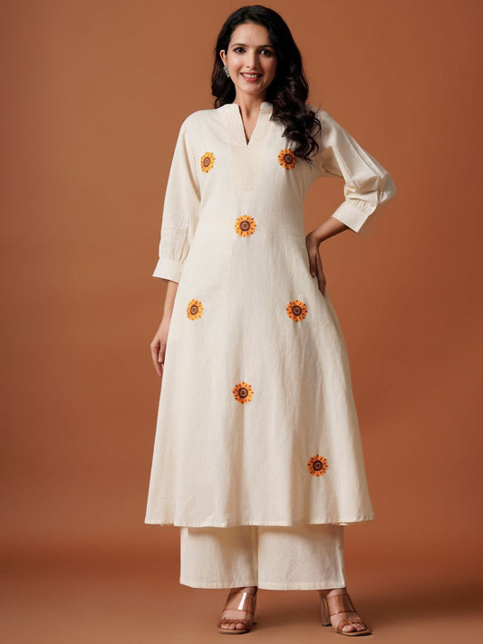 Dhiyona IE Embroidered Mandarin Collar Pure Cotton A-Line Top With Trousers