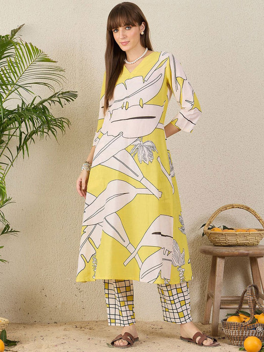 Dhiyona IE Floral Printed V-Neck Pure Cotton Tunic With Trousers
