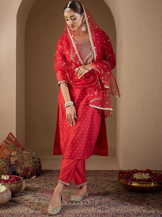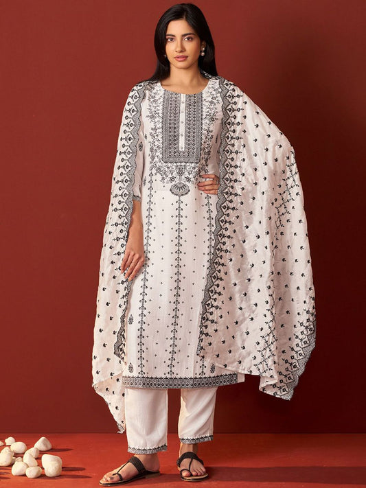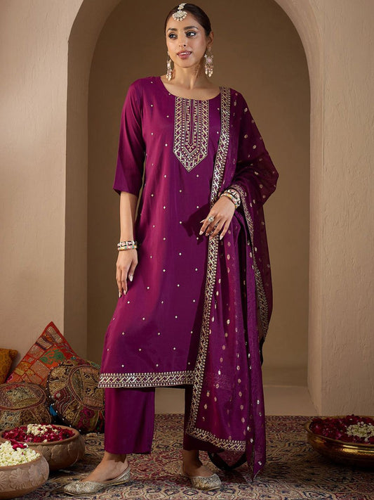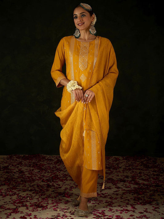 Dhiyona IE Ethnic Motifs Embroidered Round Neck Straight Kurta with Trousers & Dupatta