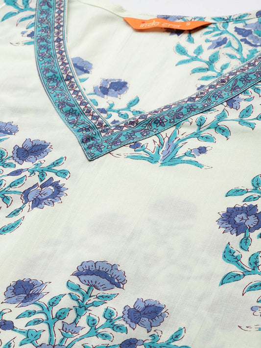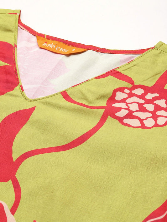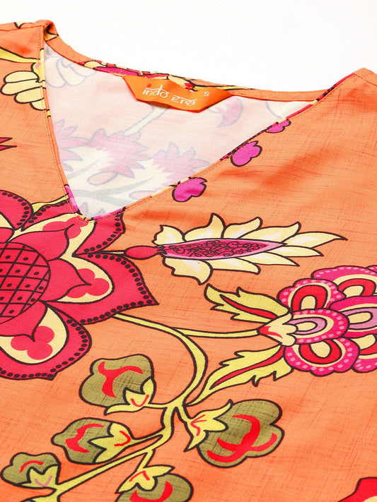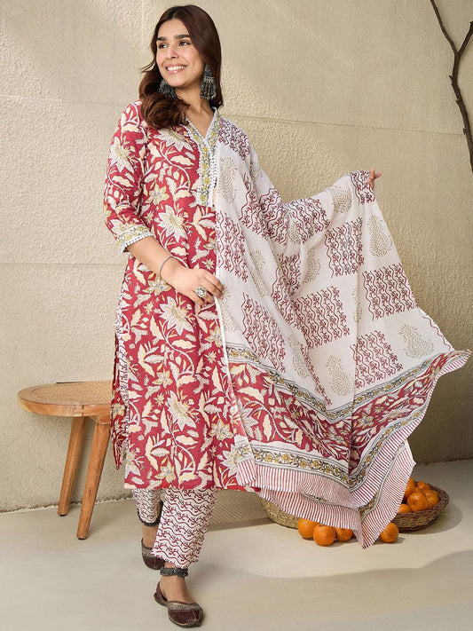 Dhiyona IE Floral Printed V-Neck Pure Cotton Straight Kurta With Trousers And Dupatta