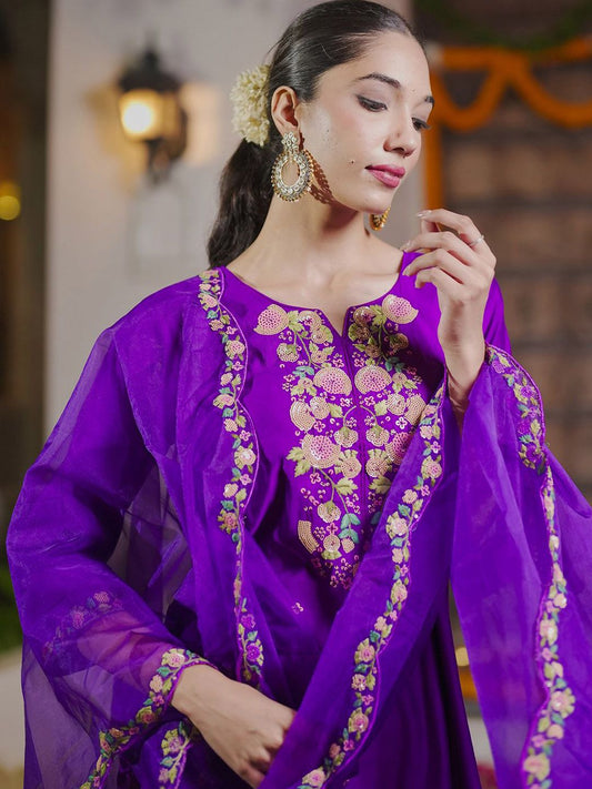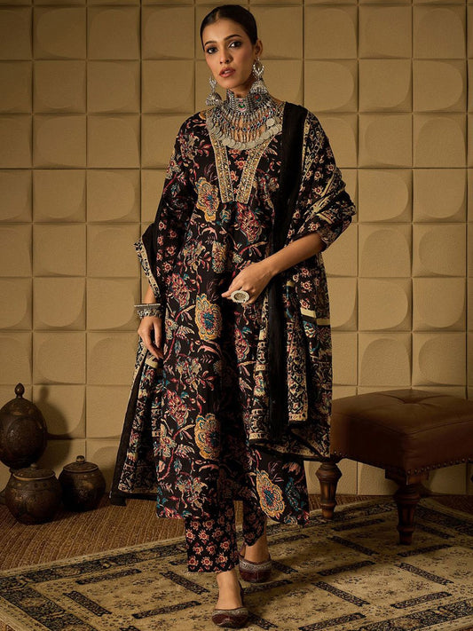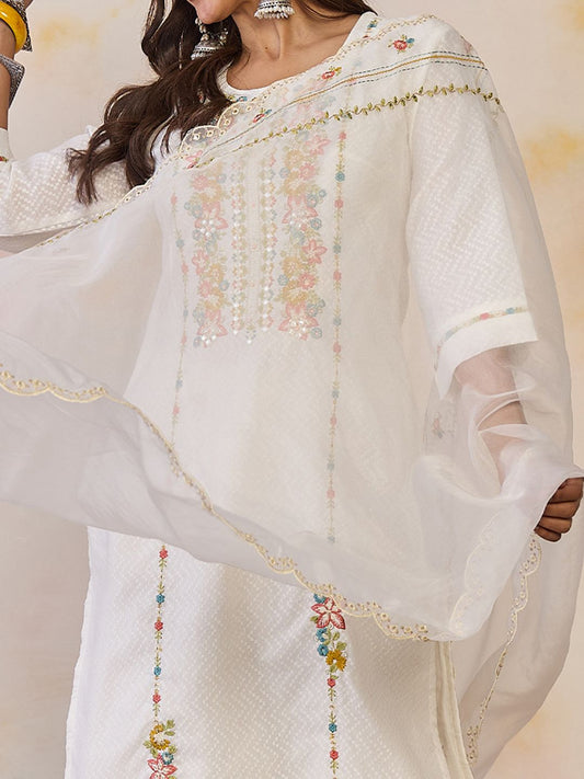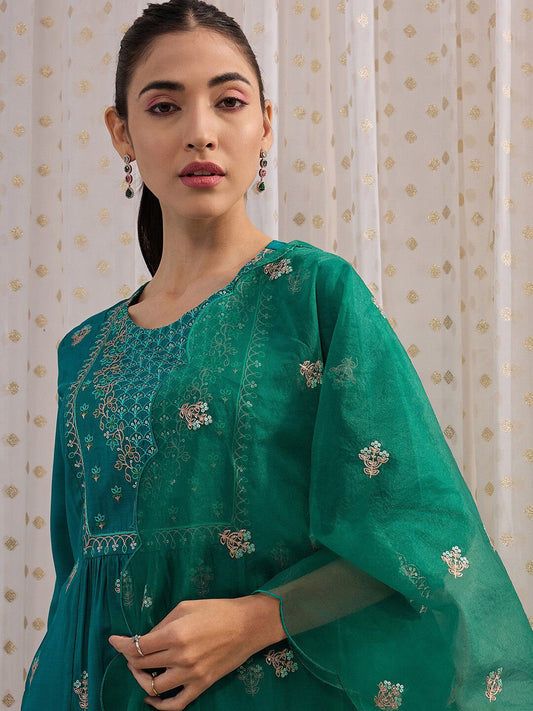 Dhiyona IE Floral Embroidered Sequinned Liva Kurta With Trousers & Dupatta