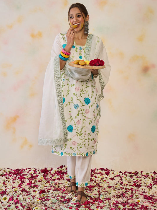 Dhiyona IE Women Floral Embroidered Regular Thread Work Pure Cotton Kurta with Trousers & With Dupatta