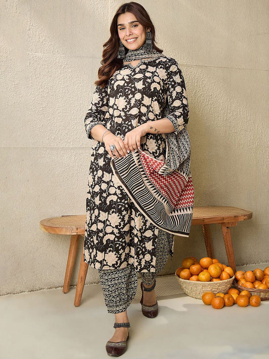 Dhiyona IE Floral Printed Notch Neck Pure Cotton Straight Kurta With Salwar & Dupatta