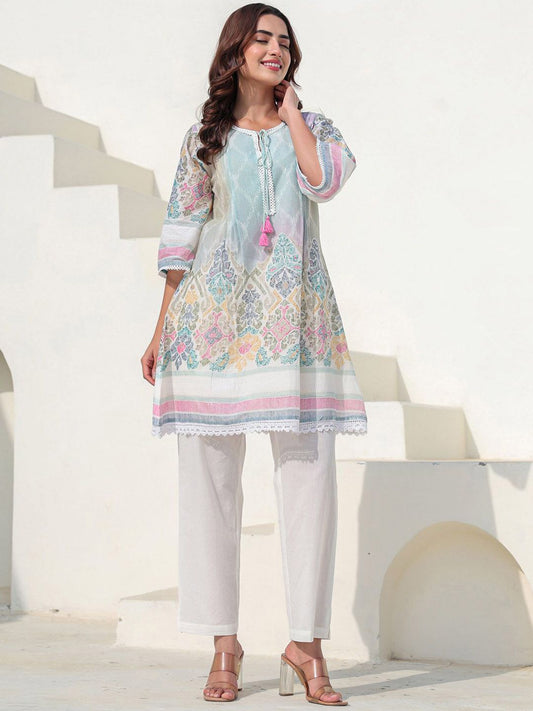 Dhiyona IE Printed Pure Cotton Mandarin Collar Neck A-Line Tunic With Trousers Co-Ords