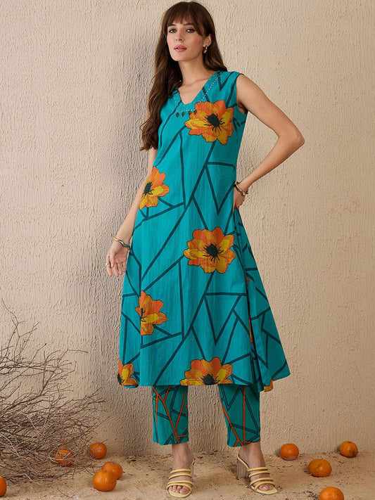 Dhiyona IE Floral Printed V-Neck Pure Cotton A-Line Tunic With Trouser