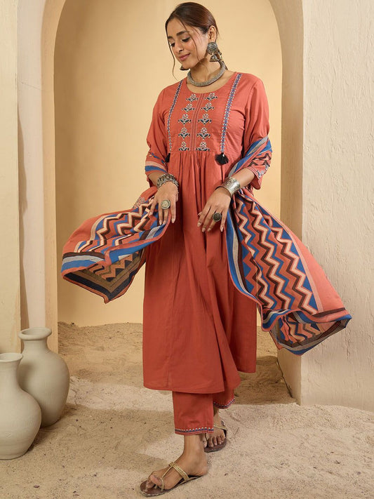 Dhiyona IE Floral Yoke Design Thread Work Pure Cotton A-Line Kurta With Trousers & Dupatta