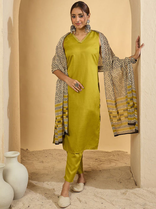 Dhiyona IE Ethnic Motifs Embroidered Round Neck Kurta With Trousers & Dupatta
