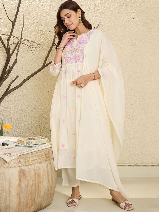 Dhiyona IE Embroidered Notch Neck Thread Work Pure Cotton Kurta With Trousers & Dupatta