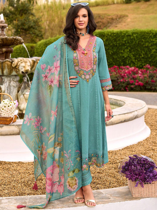Dhiyona IE Floral Embroidered Mirror Work Pure Cotton A-Line Kurta With Trousers & Dupatta