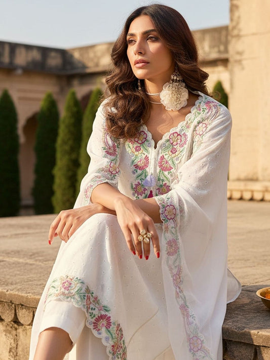 Dhiyona IE Floral Embroidered Thread Work Pure Cotton Straight Kurta With Trousers & Dupatta