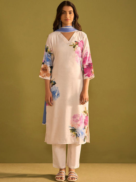 Dhiyona IE Floral Printed Beads and Stones Linen Straight Kurta with Trouser & Dupatta