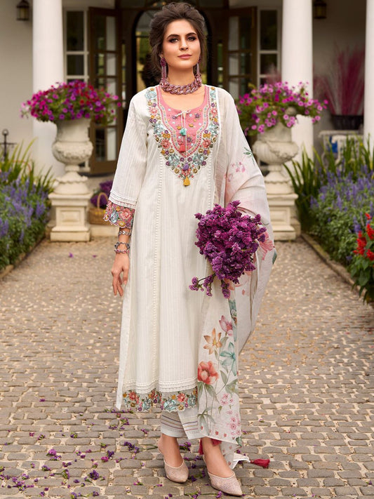 Dhiyona IE Floral Embroidered Thread Work Pure Cotton Straight Kurta & Trousers With Dupatta