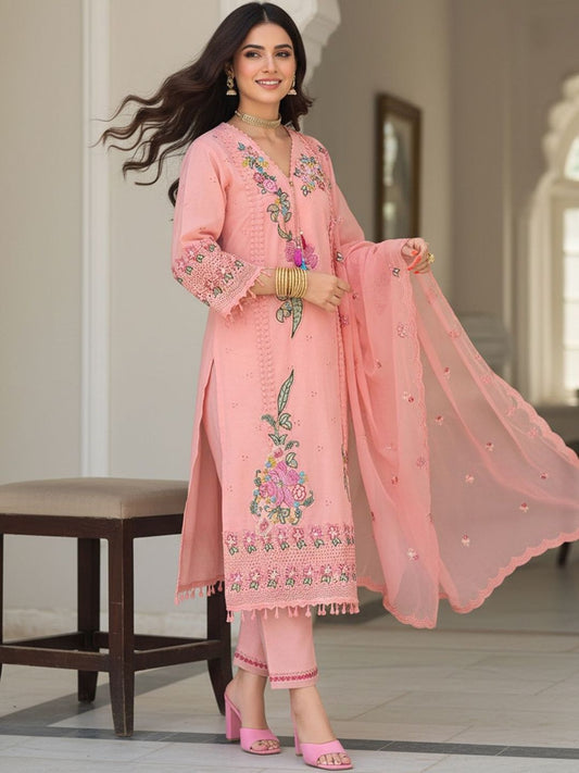 Dhiyona IE Floral Embroidered Thread Work Pure Cotton Kurta with Trouser & Dupatta