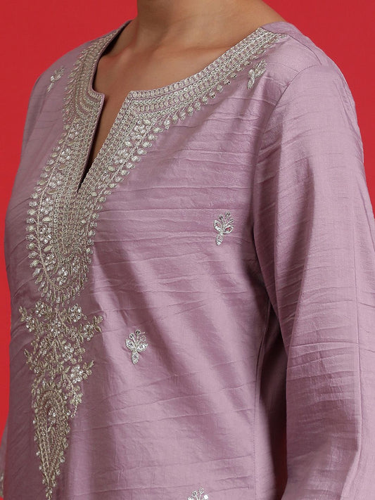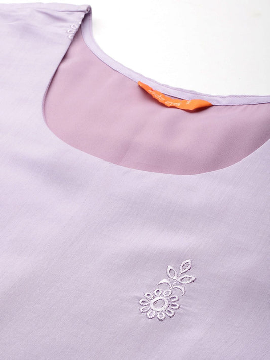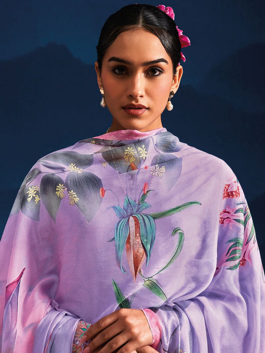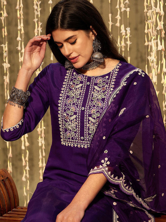 Dhiyona IE Purple Floral Yoke Design Thread Work Straight Kurta With Trousers & Dupatta