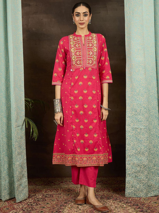 Dhiyona IE Women Ethnic Motifs Printed Thread Work Pure Cotton Kurta Trousers