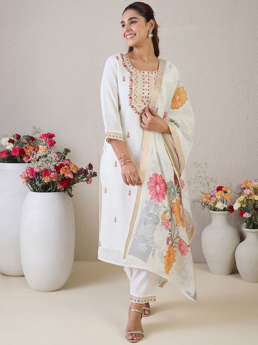 Dhiyona IE Floral Embroidered Regular Thread Work Straight Kurta with Trousers & Dupatta