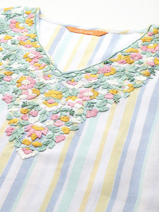 Dhiyona IE Striped Thread Work Pure Cotton Kurta with Trousers