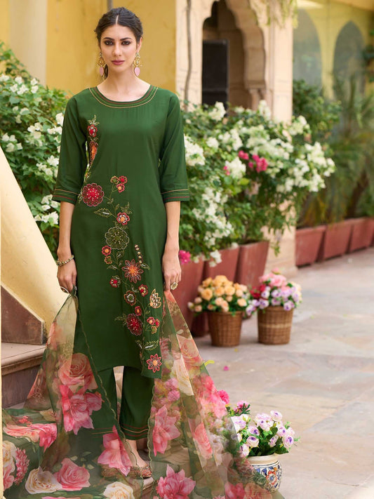 Dhiyona IE Women Floral Embroidered Kurta with Trousers & Dupatta