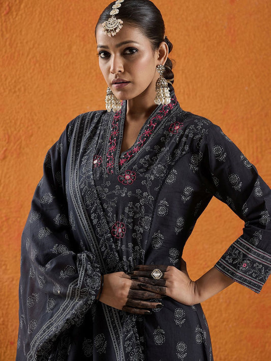 Dhiyona IE Floral Printed A-Line Mirror Work Pure Cotton Kurta with Trousers & Dupatta