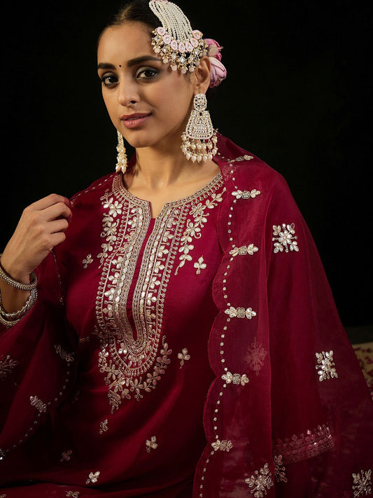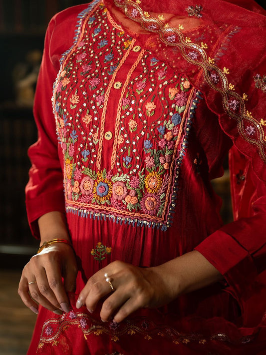 Dhiyona IE Red Ethnic Motifs Embroidered Regular Kurta with Trousers & Dupatta
