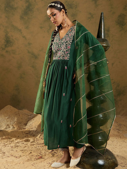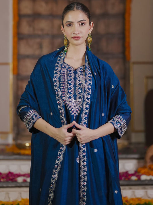 Dhiyona IE Floral Embroidered Thread Work Kurta with Trousers & Dupatta