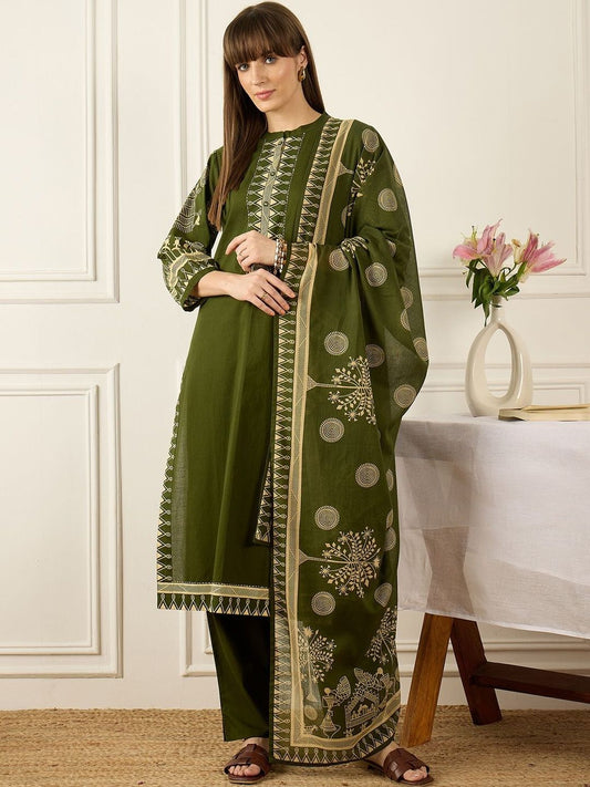 Dhiyona IE Geometric Printed Empire Thread Work Pure Cotton Kurta with Trousers & Dupatta