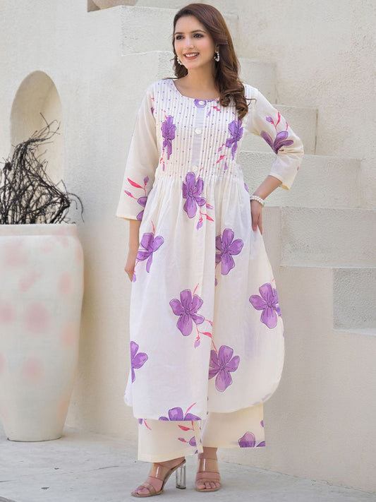 Dhiyona IE Floral Printed Round Neck Pleated Pure Cotton A-Line Kurta With Palazzos
