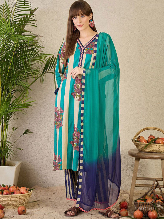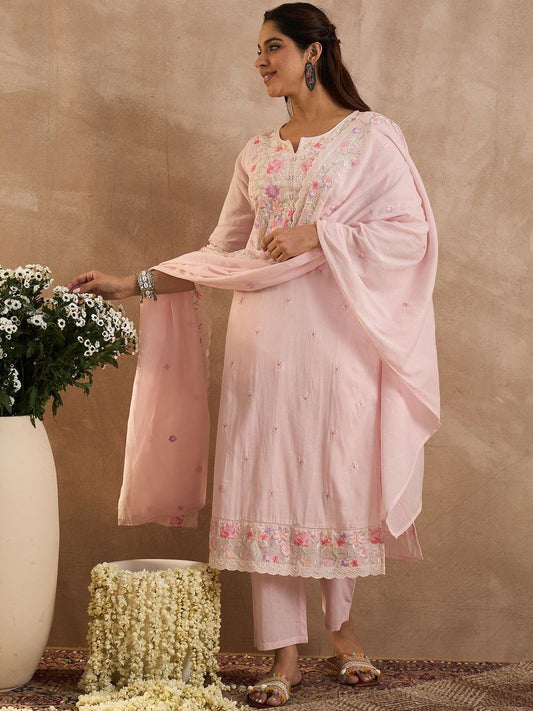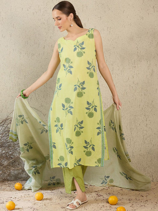 Dhiyona IE Floral Embroidered Notch Neck Pure Cotton A-Line Kurta With Trousers & Dupatta