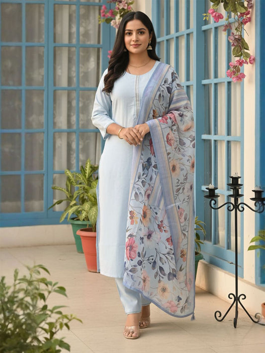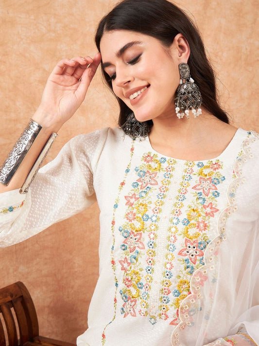 Dhiyona IE Floral Yoke Design Round Neck Thread Work Straight Kurta & Dupatta with Trousers