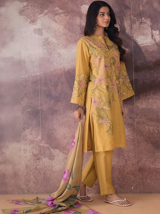 Dhiyona IE Floral Embroidered Mandarin Collar Pure Cotton Kurta & Trousers With Dupatta