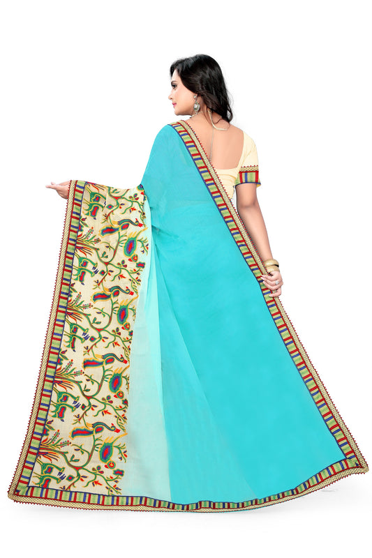 Women's Pure Chiffon Teal blue Embellished Designer Saree With Blouse Piece