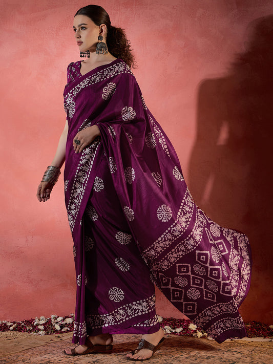 Women's Cotton Blend Magenta Printed Designer Saree With Blouse Piece
