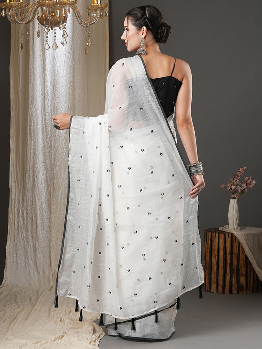 Women's Cotton Silk White Embroidered Designer Saree With Blouse Piece